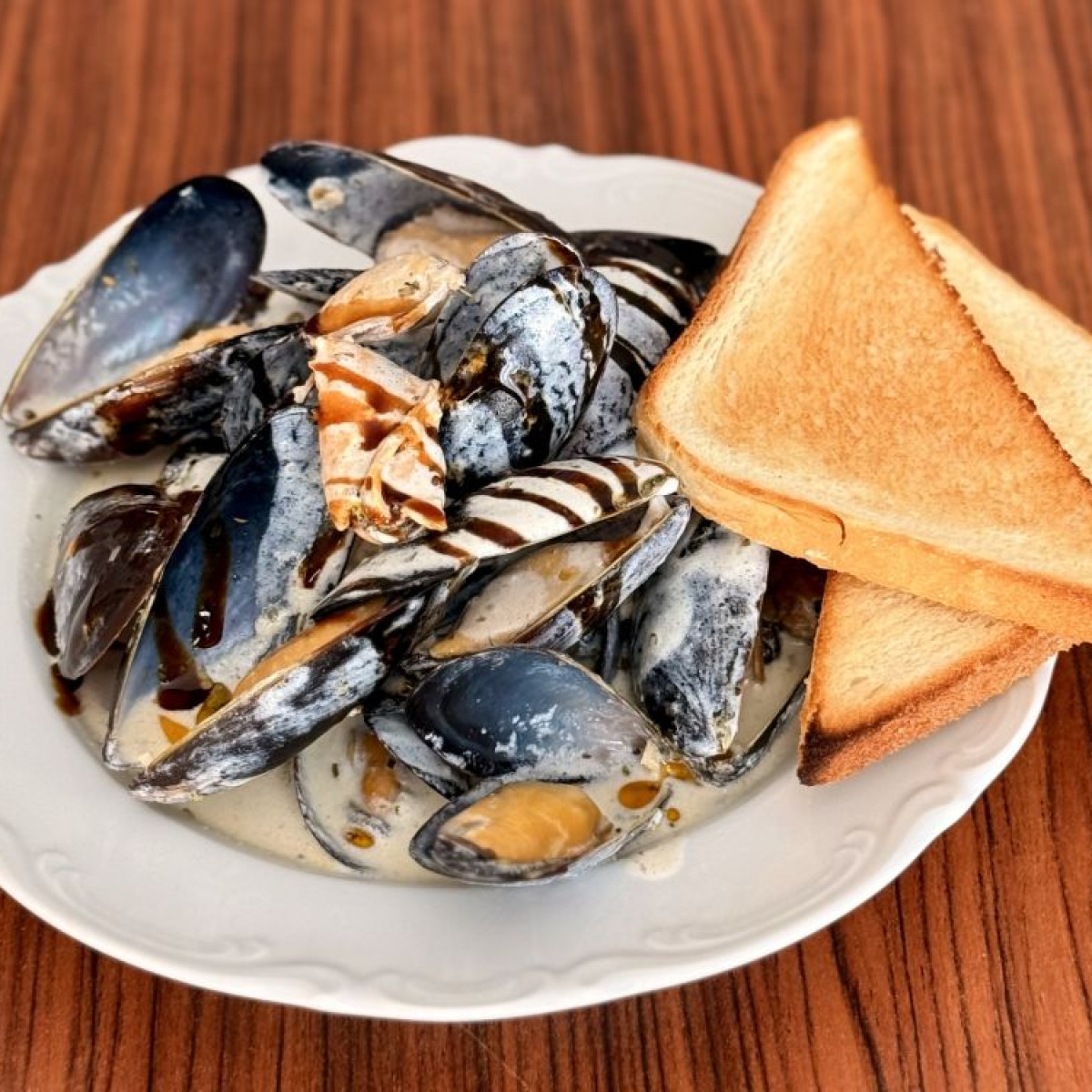 Мидии, сливки, масло сливочное, поджаренный хлеб