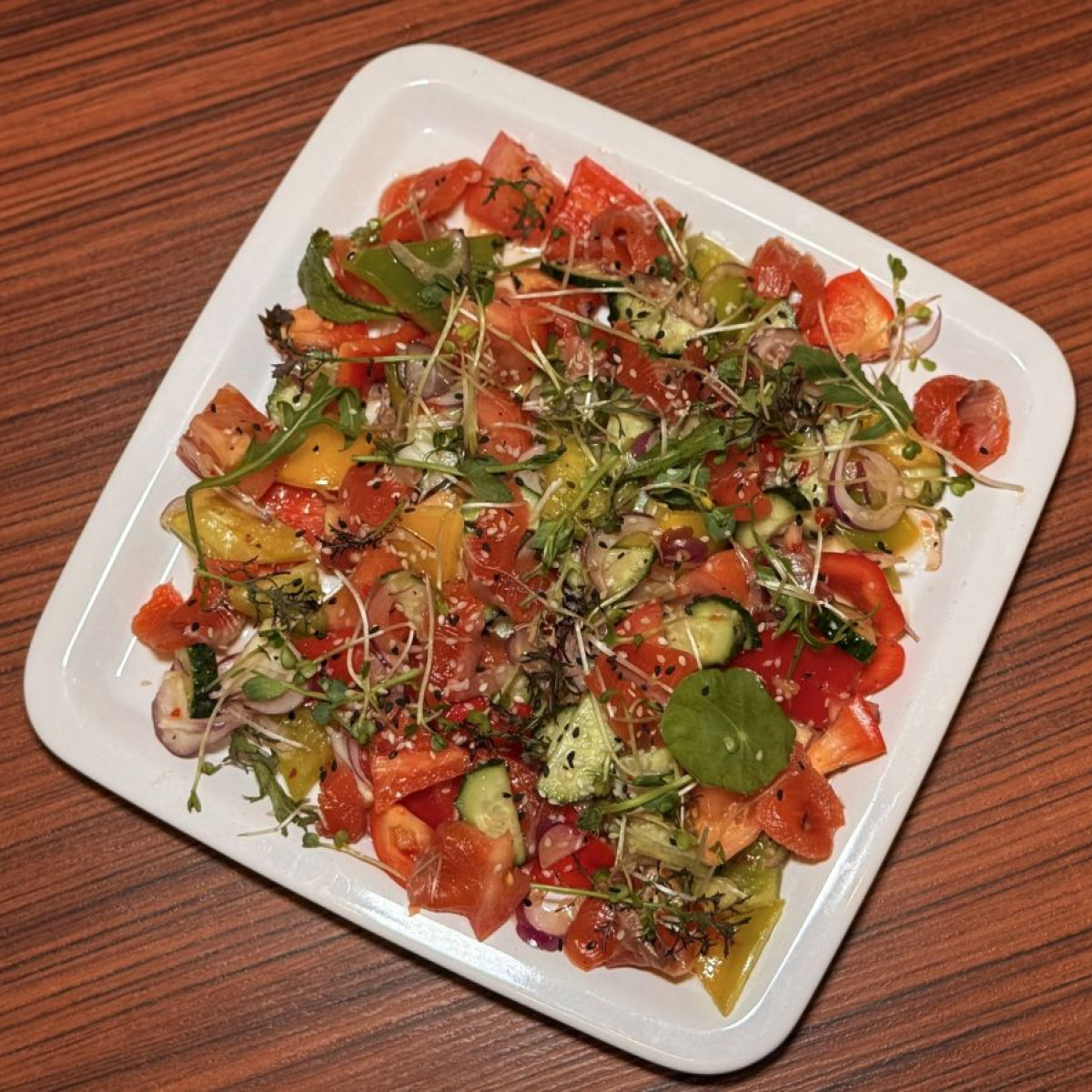 Семга, помидор свежий, огурец свежий, перец болгарский красный, крымский лук, масляная заправка кисло-сладкая, кунжут поджаренный. 180/5 гр