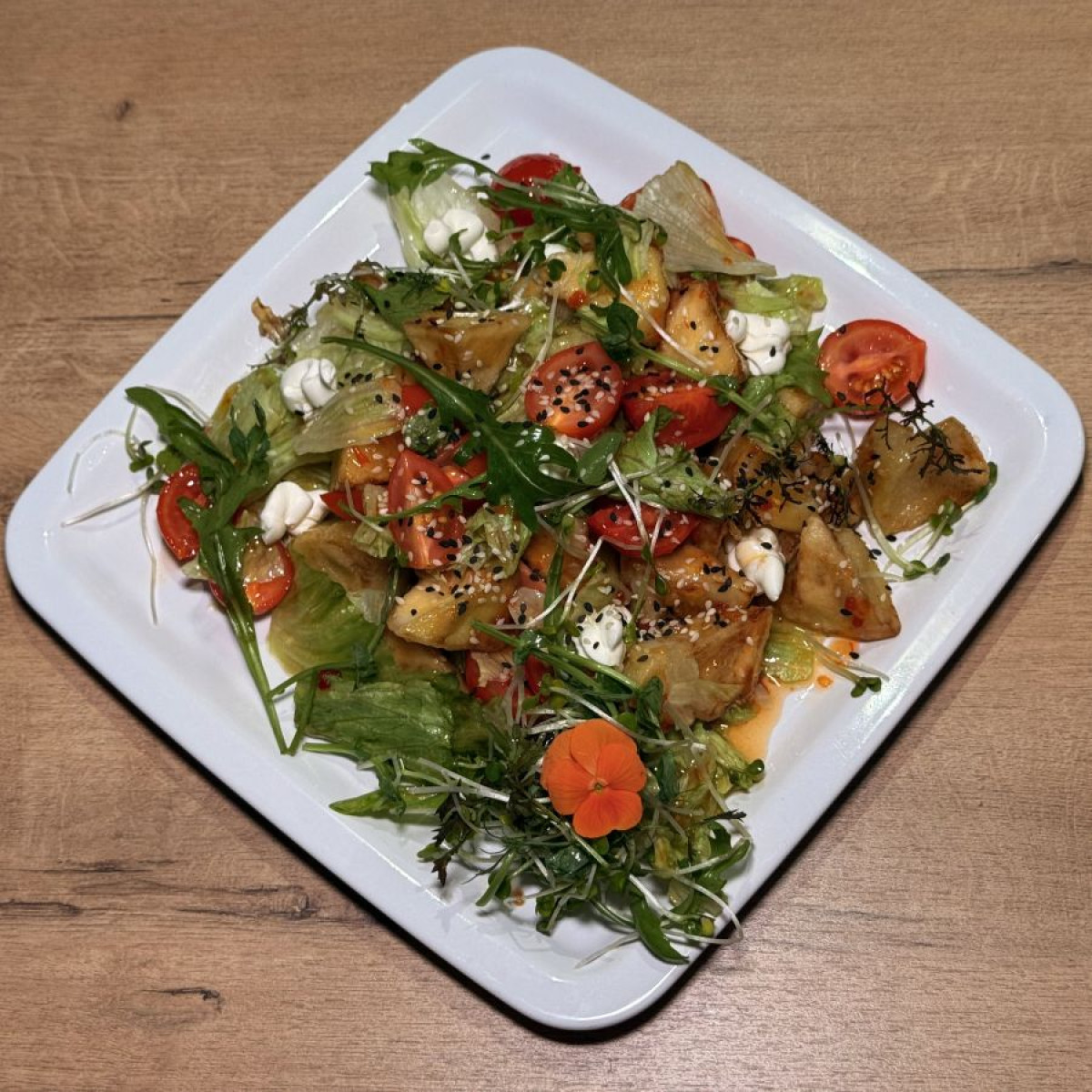 Баклажаны обжаренные во фритюре, помидоры, сыр творожный, соус сладкий чили, чеснок, листья салата, кинза, кунжут черный.
